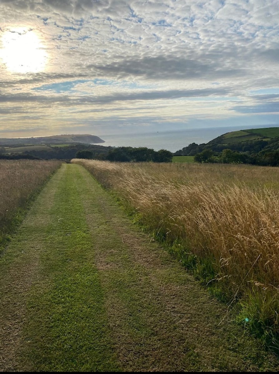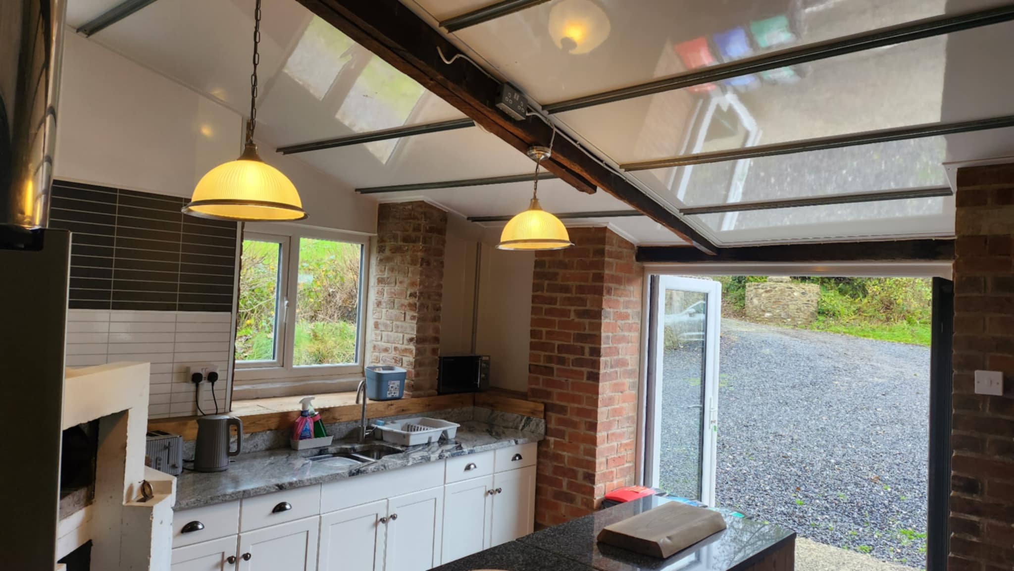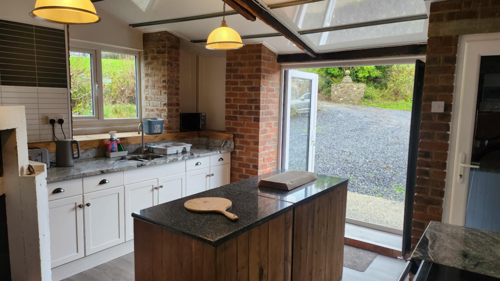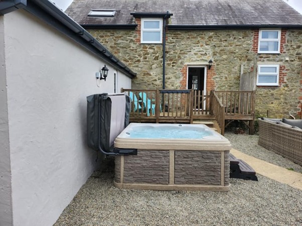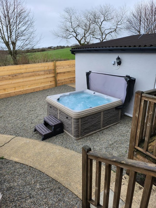 The hall opens to the outdoor decking and garden, offering stunning views of the sea and countryside. Unwind in your private hot tub—the perfect spot to watch the sunset over the water.