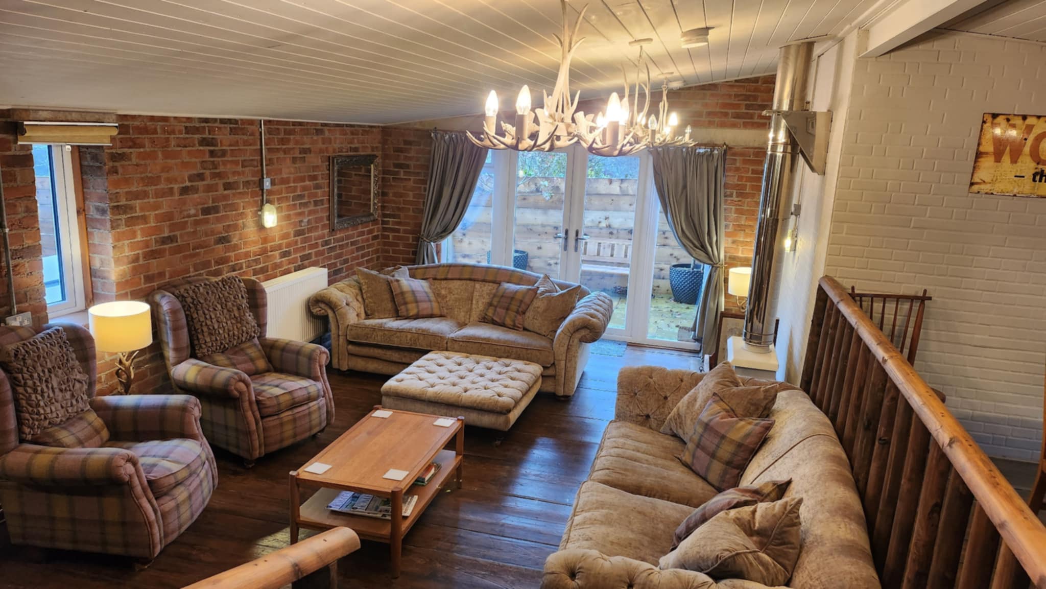 Just two steps from the kitchen, with a handy handrail, is the spacious lounge. Featuring a 65-inch TV, log burner, and a large oak dining table for eight, it’s ideal for family dinners, games, or get-togethers. A side unit stocked with glasses—including plastic ones for the hot tub—doubles as a convenient drinks station. Patio doors provide direct access to the garden, giving you multiple ways to enjoy the outdoor space.